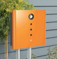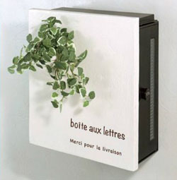 パネルと一体化させたポットに、壁に植物を飾る感覚でフェイクグリーンをあしらったポスト。「上入れ、横出しで前面パネルは開閉せず」という特徴を活かしたデザイン。置いておくだけでは、盗難や転倒の恐れのある小さなグリーンもポストと一体だから安心です。立体感のあるグリーンでファサードを清々しく。