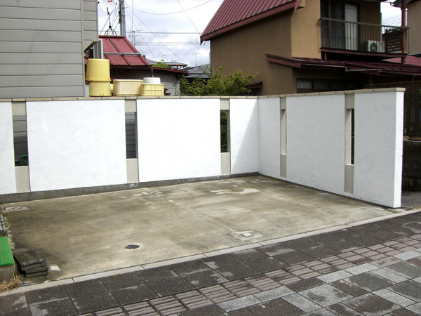 そこでまず東側駐車場の境界ブロック塀にあったラチスフェンスを撤去して、モダンなツートンカラ―の漆喰風壁を新設。そして、西側に元々あった片流れのカーポートを再利用して、漆喰風塗り壁のおしゃれな犬小屋を提案させて頂きました。