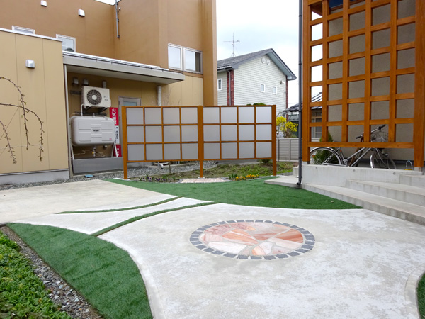 ご要望はモダンな家に合わせ、カーポート・アプローチ周りの人工芝、更に目隠しフェンスと花壇。