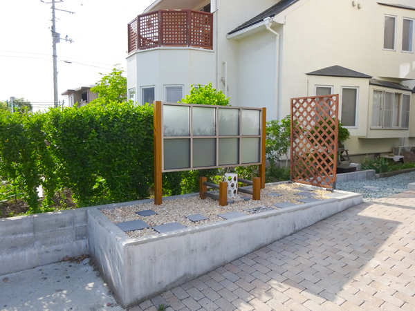 花壇後方には周りの既存ラチスフェンスとの相性や燐家に光が入る様に配慮した格子型フェンスを建て、その切り落とした柱部材にアルミ半丸材を追加して、低価格でカッコイイオリジナルモニュメント風フェンスを造作させて頂きました。