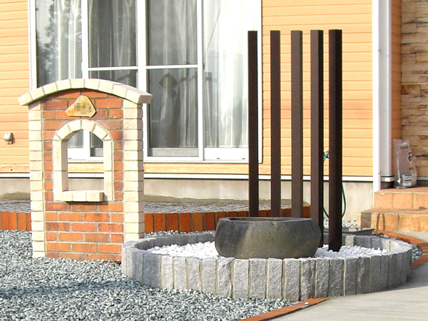 そこで、ピンコロ(天然石)の白みかげを積んだ丸い花壇の中につくばいを収め、後方にあえて木調のアルミ柱を円状に置く事で、モダン調に仕上げ、カジュアルな雰囲気に馴染むように工夫しました。
