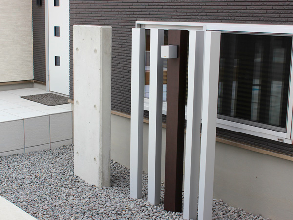 更に玄関前にはアルミ柱とコンクリート擁壁で門柱を設置。さらに既存アプローチ横は中庭の土間コンクリートデザインに合わせ、幸せ外構させて頂きました。
