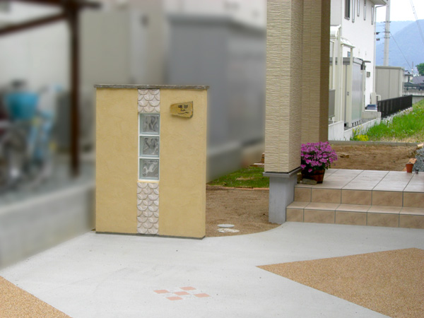 そこで今回のチャレンジはガラスブロックと天然石の花びらのオリジナル門柱を提案させて頂きました。
