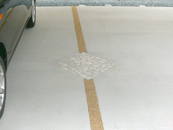 そこで今回のチャレンジはガラスブロックと天然石の花びらのオリジナル門柱を提案させて頂きました。 アプローチもシャープなイメージの中にタイルを花びらに見立て、デザインさせて頂きました。