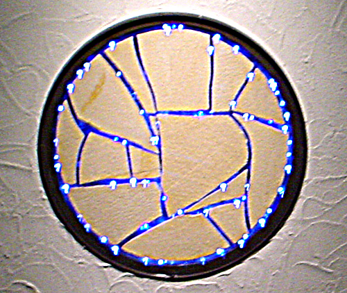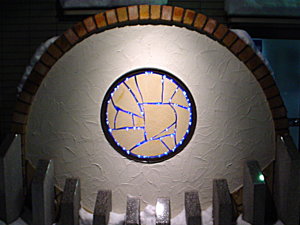 そこで考え出したのは、自宅展示用に考えていた、割り石の目地を光らせるアイデア・・・。更にレンガと石柱を使いまつ毛を表現させて頂きました。
