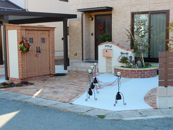 ご要望は、おしゃれでかわいい個性的な外構。 そこで先ずカーポートの中には考案したオリジナル土間飾りや天然石を入れ、個性的でしかも高級感のある雰囲気を出し、アプローチには古レンガのハーフサイズをランダムに敷き詰め、更にディーズガーデンのカンナ物置をチョイスし玄関前をかわいい雰囲気に仕上げて見ました。