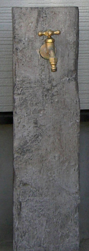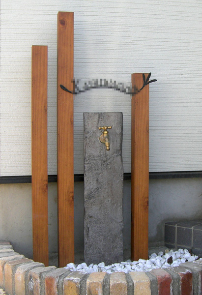 しかし、玄関前は和風・・・。そこで家の御機嫌を損なわない様に、枕木擬木とアルミ擬木ポールを使った立水栓、さらに表札をコラボし、アンティークレンガで斬新にまとめて見ました!!