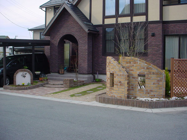 曲線状に作り直されたアプローチは以前の物とは別格!!レンガ柱をワンポイントに花壇を添えられ、まさに家そのものが持っている高級感あふれる雰囲気をさらにグレードアップする事が出来ました。