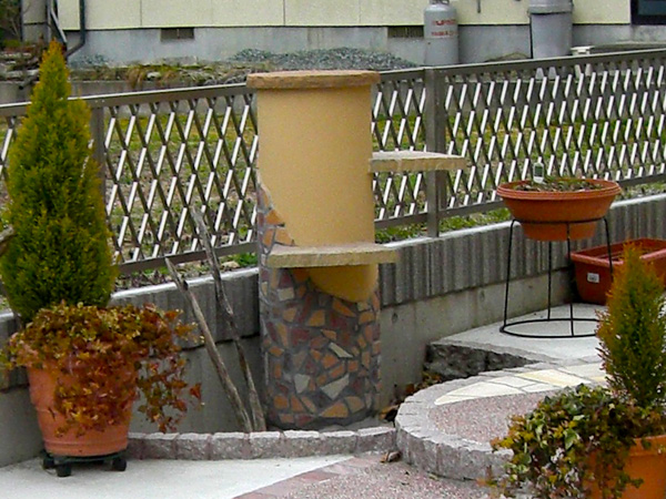 ガーデニングが大好きだと言う事で考えたオリジナルプランター柱。 プランター柱はコンクリートで作り、タイルや漆喰風壁材で化粧しました。 そこに数枚サークル用の擬石をはめ込み、玄関前を飾っています。 門柱は曲線にこだわり上下左右にくねらせ、その前には花壇を作り雰囲気を盛り上げています。 積んであるピンコロ石の目地には石材と同じピンク色になる様に色目地に仕上げました。