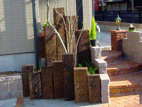 枕木花壇は車の出入りはもちろん、様々な角度から楽しめる様にわざと面を凸凹にし、味を出してあります。 天然石調のブロックやレンガで階段を作る事で、更に雰囲気をおしゃれにしてみました。