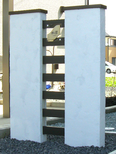 門柱には中央にアルミの横格子を入れ、更に表札は今までにない、ポリカーボネイトをあしらったおしゃれな天然石の表札も考案・・・。またまた外構家オリジナル表札に新アイテム登場です!!