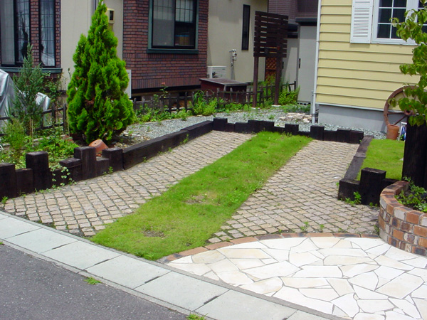 大まかな依頼の内容はリビング前の園路・バーベキュースペース。東側と南西の駐車場。 なるべく本物を使い、中庭でバーベキューなどが楽しめるスペースを造り、さらにそこを駐車場スペースとしても兼用させ、そして、ウッドデッキからも出入りできるようにすること。 プローチや門柱、レンガ、フェンス等は他社に施工して頂いたようでしたが、いくら説明をしても要望が理解してもらえない・・・。と言う事での依頼でした。