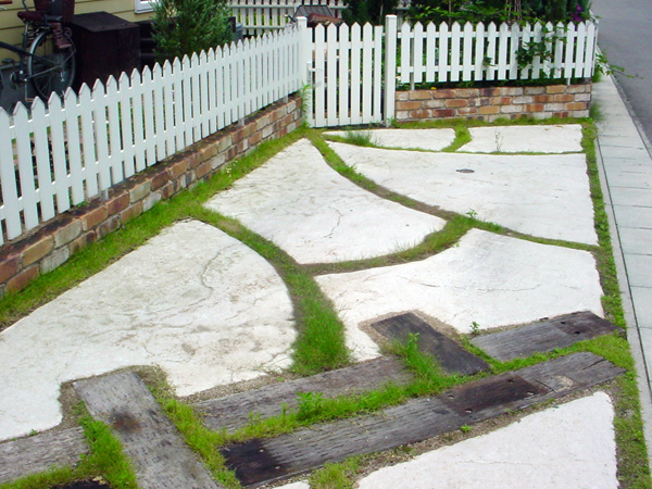 そして最後は東側の駐車場。一枚岩に似せた土間コンクリートだけでは芸がないという事で、低価格でおしゃれな擬石タイプのスタンプコンクリートを提案させて頂きました。