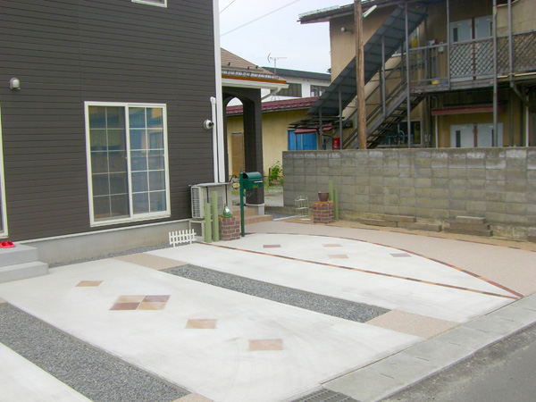 ご要望は自宅の建築で余ったタイルと天然石を使った、おしゃれでかわいいアプローチ。更に3台分の駐車場と門柱。 他社の見積もりでは予算が完全にオーバーしてしまうという事で、昨年に受注させて頂いたお客様からの紹介物件。(ありがたい事です。) しかし、要望を聞いていると予算には程遠い内容。そこで材料や工事方法を見直し、更にDIY工事も入れながら3人4脚で完成させたこだわりの物件。