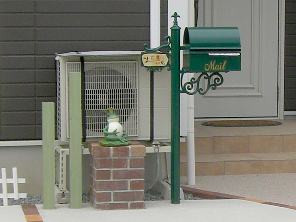 門柱の予算を下げるために施主さんが探し出して来たのは緑色のスタンドタイプの表札台付きポスト。その雰囲気に合わせてレンガのプランター台やその脇には緑色のアルミ柱を配置してかわいらしさを演出。