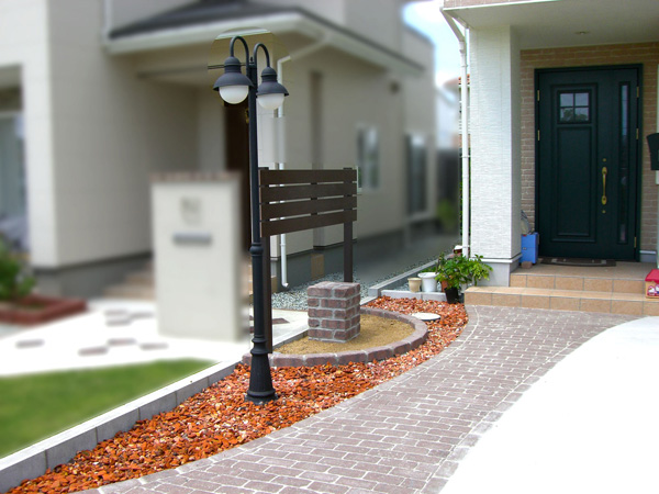 アプローチ周りには花壇や目隠しフェンス・ポールライト等を設置し、すっきりした落ち着きのある雰囲気にまとめてみました。
