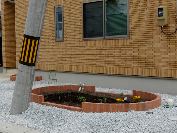 そして今回こだわったのは弊社オリジナルのこじゃれた花壇風菜園!! 家庭菜園は管理が大変特に小さいお子様がいる家庭は更に大変になり、やめる方も多く、無用の長物となりがちです。そこで弊社は、家庭菜園と花壇を兼用できるように考えました。こうする事でどちらからでも始められるばかりでなく、小さなお子様がいるご家庭では砂場としても活用が出来ると言う優れものです。お客様からも大変喜んで頂き、めでたしめでたし・・・。