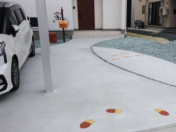当初のご要望はカーポートや駐車場と言った普通の外構・・・。 しかし、過去の施工写真が打ち合わせを思わぬ方向に・・・。という事でかわいらしさにこだわったアニメチックな外構をご提案させて頂きました。