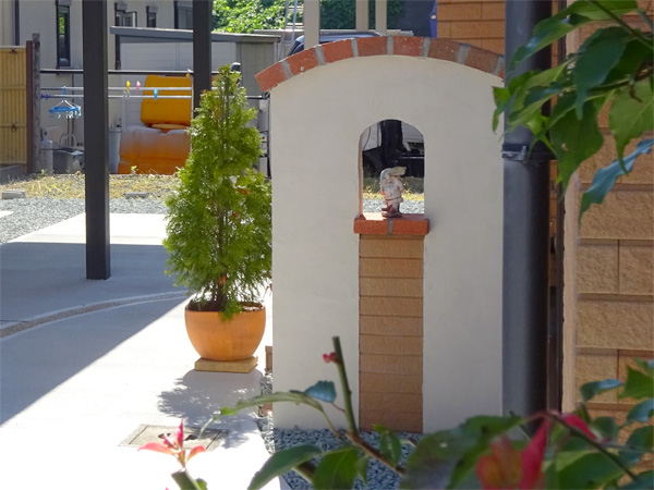 先ずは家の新築の際に余ったタイルを利用し、小窓を付けたかわいい門柱を御提案させて頂きました。