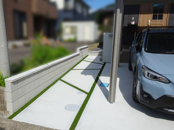 そしてここで弊社がこだわったのは経年美観。 アプローチの芝溝に水が溜まり凍害で芝が剥がれない様にラインに下穴を開け浸透式に・・・。また駐車場後方の階段ポーチ前には見切りラインを入れ、靴に付いた泥や雨水の水あか汚れが直接駐車場へ流れ込み汚れない様、経年美観にもこだわらせて頂きました。 更に4台用で6本柱タイプのカーポートと言う事で、荷重が一番掛かるカーポート中央の柱が地震や大雪で沈まない様に、基礎の作り方にもこだわり工夫させて頂きました。