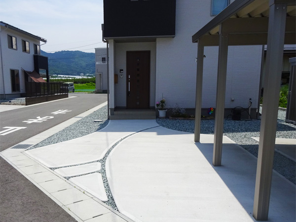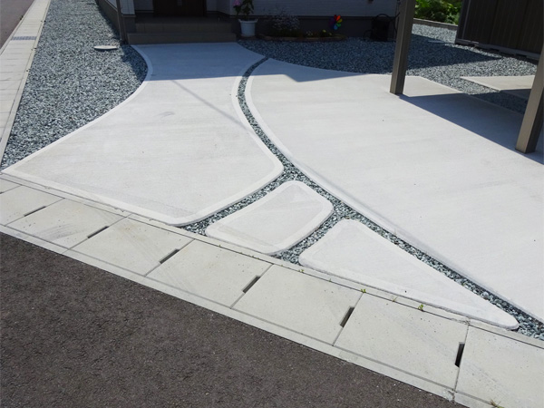 ご要望はシンプルモダンな外構と言う事で、今回はアプローチデザインにこだわらせて頂きました。 曲線美に加え、弊社が独自に考案したかっこいいデザインラインを追加し、更に磨きを掛けました。