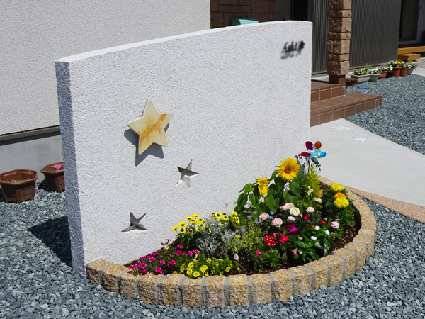 門柱には星形の切窓や、天然石を星形に加工し制作したオリジナル照明。