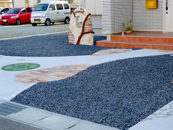 駐車場にはレトロな雰囲気を表現する為、表面をボロボロに加工し、更にアプローチにはクローバーのワンポイントや、クラシカルレンガを敷き込み、全体の雰囲気を温かい感じに仕上げて見ました。