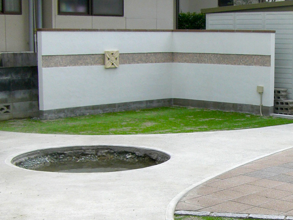 園路中央にはアクセントで将来お孫さんが遊べる砂場兼花壇を作り、そして最後にモザイクタイルをあしらった塗り壁を建て、よりおしゃれでモダンな感じに仕上げさせて頂きました。ワンポイントにはストーンリリーフを入れリゾート風に・・・。そして夜にはリリーフの裏からLEDライトが灯るにくい演出も・・・。