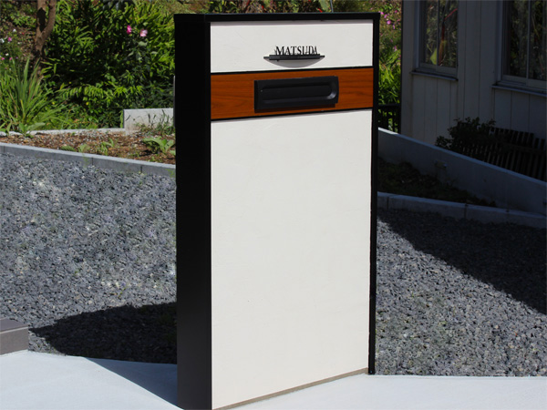 次のこだわり所はオリジナル門柱です。表札はおしゃれなLED照明付き表札。周りをアルミの笠で縁取り、更に木調ラインの中にポストをあしらったおしゃれなものとしています。 元々は某メーカーの木調門柱がお気に入りと言う事でご提案を頂きましたが、予算的に高額になってしまう事と、家の雰囲気が暗くなってしまうとの理由で、創作門柱に切り替えさせて頂きました。仕上がって見ると「やはり正解でした・・・。」と言う事で、大変喜んで頂けた様です。