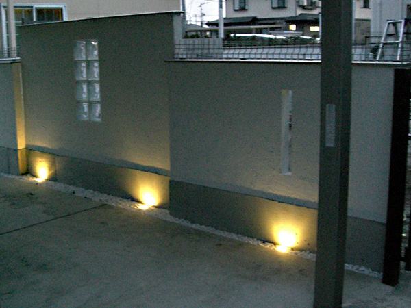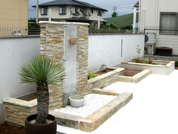 通常の流水口はブロックに挟み込んで使うので取付は簡単だが、この場合は無理。とそこでガラスを使った門柱が浮かんだ。「これだあ〜!!その真後ろからライティングすれば・・・。月夜の晩にこんにちわ!!て感じ・・・。更に板を伝って落とすので、音の問題はもちろんコケ等の汚れ問題も解決できるので一石四鳥!!そして更に水受け表面に化粧石を敷き詰める乾式タイプにすることで消音効果はか・ん・ぺ・き・・・。ほとんどしなくなる。」後は花壇を石柱や白いブロックで前後左右と上下に変化を加えて、最後は白いタイルデッキにワンポイントを入れ、白いウッドデッキを階段と腰掛けかわりにして設計完了!!