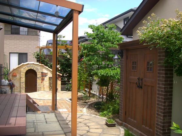 今回はレトロな壁と前に施工したパーゴラの下に古レンガを敷き込む事に・・・。 壁はモルタル造形でレトロな雰囲気に彫刻し、笠には洋瓦をあしらい、石柱風立水栓を提案させて頂きました。 また、照明好きなお客様の為に、自作の素焼き照明笠もサプライズでプレゼントさせて頂きました。