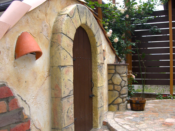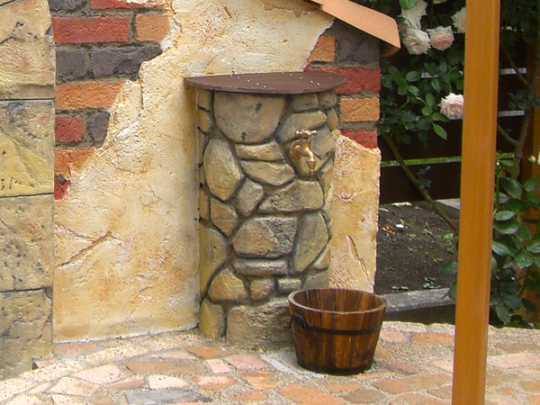 壁はモルタル造形でレトロな雰囲気に彫刻し、笠には洋瓦をあしらい、石柱風立水栓を提案させて頂きました。