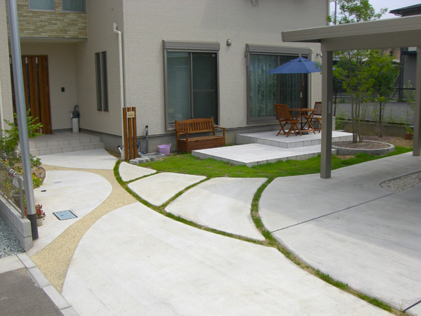 また、アプローチには曲線を活かしたデザインラインと天然石でおしゃれな模様を入れ、タイルデッキのみが目立ち過ぎない様に外構全体のトータルバランスを整えデザインさせて頂きました。