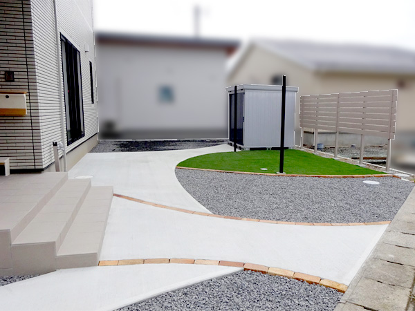 また、高価なウッドデッキを取り止め、予定にはなかった玄関から物置に至るまでの通路を作り、その一部を弊社オリジナルのコンクリートデッキで兼用できるおしゃれな園路デッキを提案!!更に、開け閉めがし易い様に物置の扉を左右逆に納めさせて頂きました。