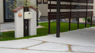 ご要望は家とポストに合わせたかっこいい外構。カーポート、お客様駐車場2台にガラスブロックを取り入れた門柱と野球が楽しめるグラウンド・・・。