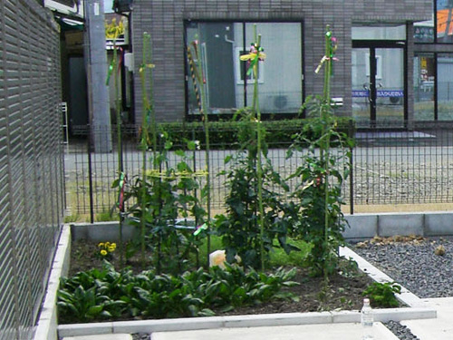 最後は目隠しフェンス。とにかく家と道路が近すぎる為、直接アルミ柱で立ち上げてしまうと除雪の際に雪の重みで曲がってしまう危険があると言う事で考え出したのはテラス戸下にあえて花壇を作り、その中にフェンスを収める方法。これなら冬も安心です!!