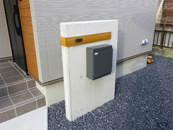 一般的なコンクリート門柱は打ちっ放し感を好む方も多いと思いますが、今回はおしゃれ感を出す為、ワンポイントに表札周りの装飾を考案。しかし市販品はかなり高額になってしまう所から、木調のアルミの板をL型に加工しそこに表札を組み込むアイデアで予算を浮かせています。